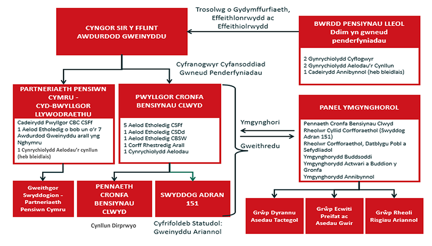 Mae’r Cyngor hefyd wedi dirprwyo cyfrifoldebau penodol i Bennaeth Cronfa Bensiynau Clwyd. Cafodd y strwythur llywodraethu hwn ei ehangu ddechrau 2015 yng ngoleuni’r gofyniad yn Neddf Pensiynau Gwasanaethau Cyhoeddus 2013 i gyflwyno bwrdd pensiynau lleol i gynorthwyo â chydymffurfiad mewn perthynas â materion cysylltiedig â’r gronfa bensiynau. Ehangwyd y strwythur eto fyth ym Mawrth 2017 pan sefydlwyd Pwyllgor Cyd Lywodraethu Cronfeydd Buddsoddi Cymru a Gweithgor Swyddogion er mwyn hwyluso’r gwaith o gyfuno asedau cronfeydd pensiynau yr wyth Cronfa Bensiynau Llywodraeth Leol yng Nghymru. Dangosir strwythur llywodraethu'r Cyngor ar gyfer materion cronfa bensiynau isod: