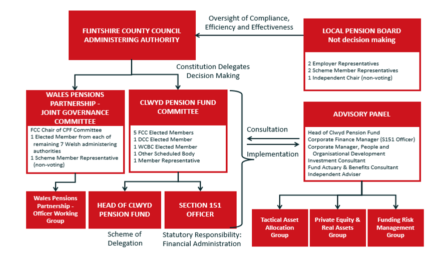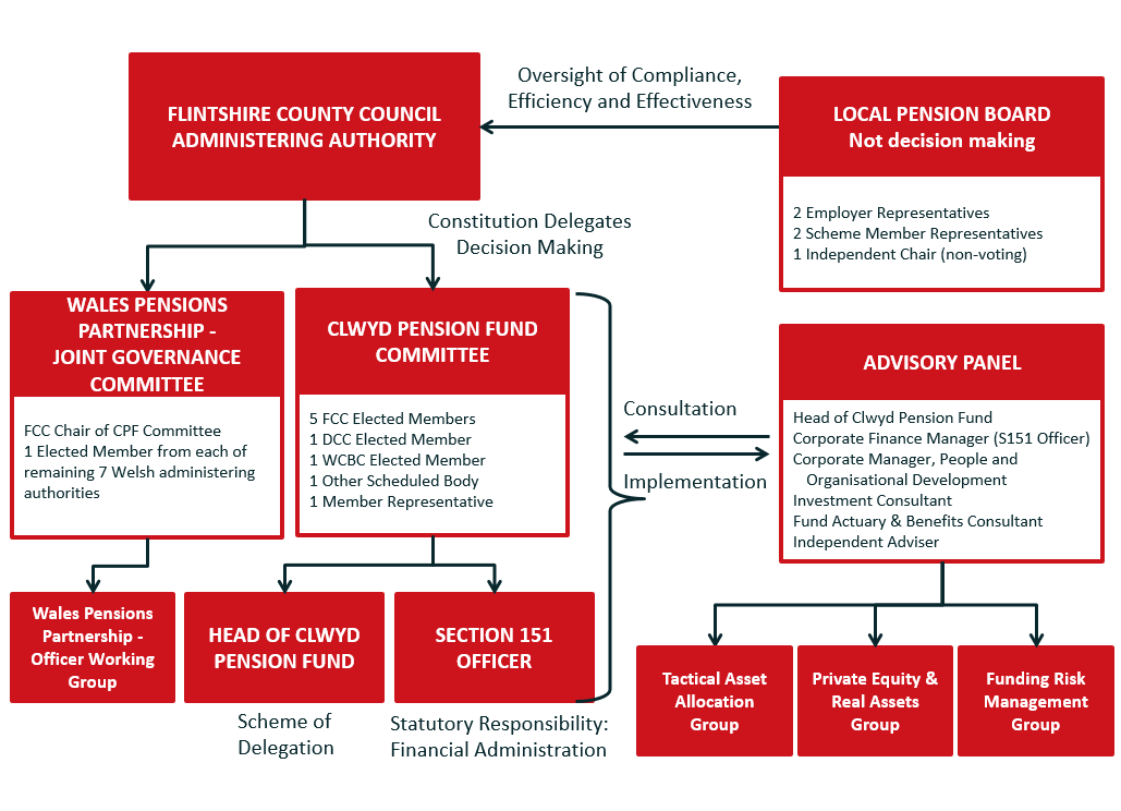 Flintshire County Council reviewed its Governance arrangements for the Clwyd Pension Fund in 2014. Prior to this date, the responsibility for the Clwyd Pension Fund rested with the Head of Finance who reported to the Clwyd Pension Fund Panel made up of elected members from Flintshire County Council, Denbighshire County Council and Wrexham County Borough Council. In addition the panel had non-voting members including an independent adviser and a scheme member representative.
